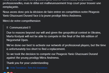 „Din motive dincolo de voința noastră și având în vedere contextul geopolitic din Ucraina, Marta Kostyuk nu va putea concura în finala celei de-a 6-a ediții a Negometal Open. Am făcut tot posibilul să ne activăm rețeaua de jucători profesioniști, dar timpul este din păcate prea scurt pentru a găsi o înlocuitoare