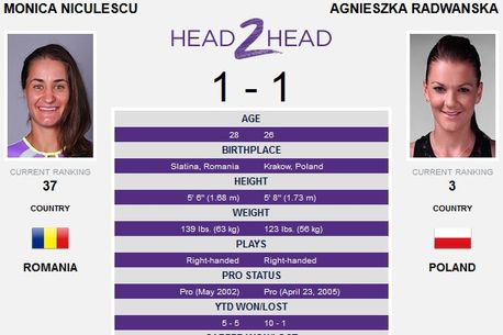 „Moni” știe cum să o învingă pe „Aga”, ținând cont că a bătut-o si în 2015, în precedenta partidă directă disputată de cele două în circuit: 5-7, 6-4, 6-0 în semifinale la Nottingham (Marea Britanie), pe iarbă. La general, scorul dintre Niculescu și Radwanska este egal, 1-1, poloneza triumfând și ea în anul 2009, la Linz (hard), scor 6-4, 6-2.