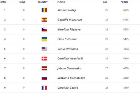 Halep are 6.175 de puncte în visterie, păstrând un avans de 40 de puncte în fața ibericei Garbine Muguruza! Practic, Top 10 WTA a rămas neschimbat față de săptămâna trecută: Karolina Pliskova (Cehia) completează podiumul, Elina Svitolina (Ucraina) se află pe locul 4, Venus Williams (SUA) ocupă poziția a 5-a, Carolina Wozniacki (Danemarca) e pe 6, Jelena Ostapenko (Letonia) se poziționează pe locul 7, Svetlana Kuznețova (Rusia) se află pe locul 8, Caroline Garcia (Franța) ocupă locul 9, iar Johanna Konta (Marea Britanie) este a 10-a jucătoare a lumii.