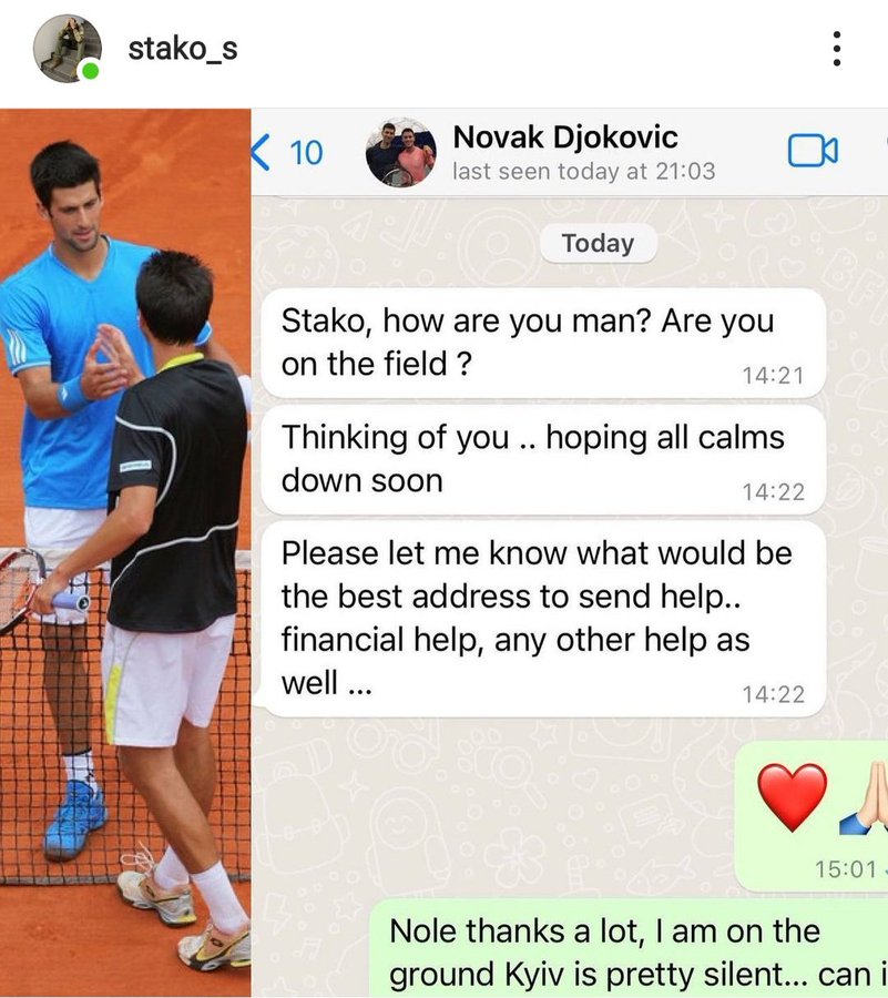 „Stako, ce faci, omule? Ești pe front? Mă gândesc la tine, sper că se va termina în curând! Te rog să îmi spui cea mai bună adresă unde pot trimite ajutorul meu… Bani, orice ai nevoie!”, i-a scris fostul lider ATP lui Stakhovsky, pe WhatsApp.