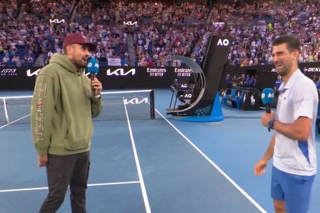 Kyrgios a comentat meciul pentru Eurosport, iar la final l-a intervievat pe Djokovic pe teren: „Arăți bine în cabina de comentator, dar sper să te revedem aici pe teren cu o rachetă în mână. Haideți, oameni buni, arătați-i puțină dragoste!”, i-a spus Djokovic lui Kyrgios. Dialogul savuros dintre cei doi a continuat: „Este un copac pe care am auzit că îl îmbrățișezi în Grădina Botanică Regală din Melbourne. Poți să îmi arăți care este copacul? Am nevoie să mă fac bine deoarece m-am săturat să te văd câștigând pe terenul acesta. Vreau să revin și să te bat”, i-a transmis Nick lui Novak.