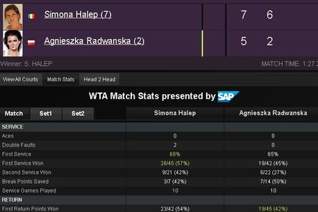 Simona Halep s-a calificat în finala turneului de la Doha, după o prestație fenomenală în fața polonezei Agnieszka Radwanska, numărul patru mondial. Românca a fost condusă cu 5-2 în primul set, însă nu a cedat în niciun moment, căutând să-și pună în dificultate adversara la fiecare punct. Radwanska s-a agățat de mingi în primele game-uri ale jocului, s-a ajutat și de serviciu și a dat impresia că va scăpa în câștigătoare a primului set. Halep a fost însă „sârboaică” la Doha, adică a luptat pentru fiecare minge, nu a ținut în niciun moment cont de rezultat și a atacat în permanență. Roadele s-au văzut însă abia din game-ul opt, când a reușit să rupă seria polonezei și să-și înceapă propria serie. Una care s-a întins pe durata a opt game-uri! De la 2-5, eleva lui Fissette a ajuns la 7-5, 3-0, rezultat care a descumpănit-o total pe Radwanska. Dar poloneza pur și simplu nu a avut reacție la forcing-ul româncei. Simona și-a sufocat permanent adversara cu toată gama de lovituri, transformate în mingi câștigătoare (n.r. 25-13 a arătat statistica după cele 87 de minute). La final, Halep s-a impus cu 7-5, 6-2, în dreptul ei fiind trecute nu mai puțin de șapte break-uri din 14 șanse create!