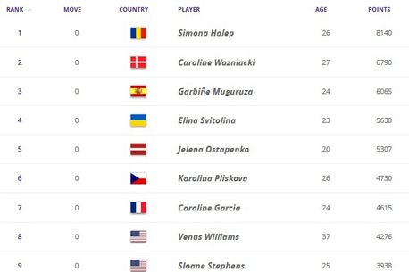 Primele patru rachete ale României staționează în clasamentul WTA: Simona Halep conduce ierarhia, Sorana Cîrstea se află pe locul 34, Irina Begu ocupă poziția 38, iar Mihaela Buzărnescu e pe locul 40. În schimb, Monica Niculescu a urcat un loc, aflându-se pe 64 WTA. Jucătoarele importante sunt în vacanță în această perioadă, astfel că în Top 10 nu s-a produs nicio schimbare.