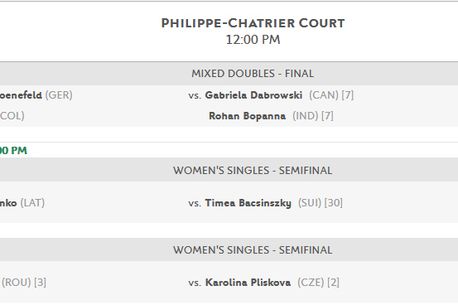Pe terenul „Philippe Chatrier” se va juca mai întâi finala de dublu mixt, de la ora 13:00 în România, apoi la 16:00 se dă start joc în meciurile care decid finalistele ediției 2017 la Paris. Sărbătoritele zilei joacă primele: Ostapenko împlinește mâine 20 de ani, iar Timea Bacsinszky – 28 de ani.