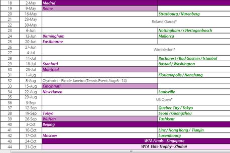 Reprezentanții WTA au publicat miercuri calendarul competițional pentru sezonul 2016. Trendul mondial înseamnă globalizare, reprezentanții forului mondial care guvernează circutiul feminin al tenisului profesionist remarcând între cele mai importante schimbări ale viitorului sezon: înregistrarea unui număr record de nouă turnee concentrate în zona China – Hong Kong – Taiwan, considerată piață-cheie pentru sportul alb feminin și beneficiară a unei creșteri spectaculoase, de la doar două turnee jucate în această zonă, în 2012; debutul turneelor din Mallorca (Spania) și Louisville (Kentucky, SUA), precum și faptul că Doha ia locul, conform sistemului rotațional deja consacrat, Dubai-ului (turneu câștigat de Simona Halep în 2015) în lista de competiții de nivel Premier 5.