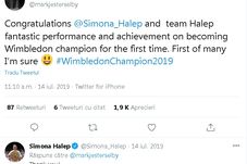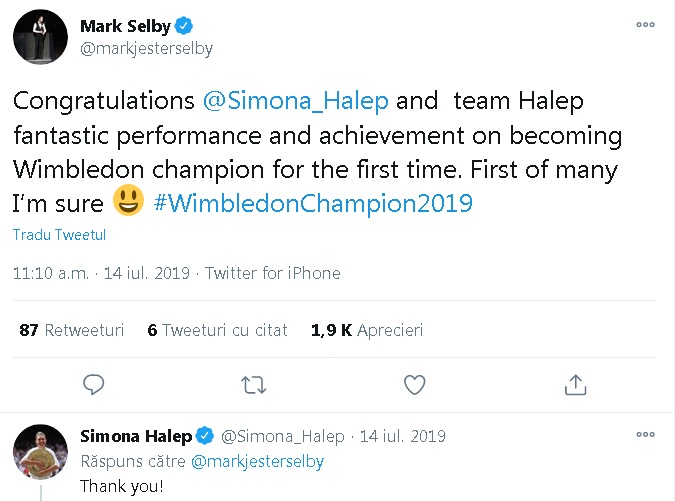 Mai mult decât atât, Mark Selby i-a transmis mesaje Simonei Halep atât înainte, cât și după finala cu Serena Williams, scor 6-2, 6-2: „Sper ca Simona să câștige finala. Sunt cu toată inima alături de ea la finală” și „Felicitări, Simona, pentru câștigarea primului titlu la Wimbledon. Sunt sigur că vor urma și altele”, au fost mesajele lui Selby pentru Halep, românca răspunzându-i imediat englezului: „Mulțumesc!”.