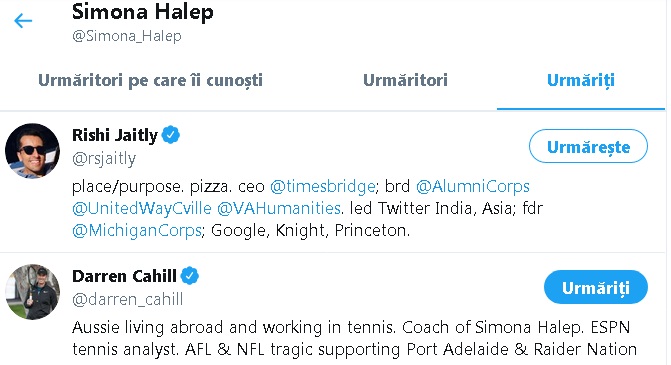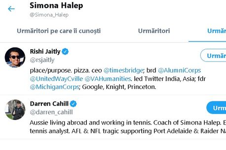 Dacă Simona Halep i-a dat unfollow lui Mark Selby, cel poreclit „Bufonul din Leicester” o urmărește în continuare pe a doua jucătoare de tenis a lumii! Curios este faptul că Simona urmărește, la fel ca și anul trecut, numai două persoane pe Twitter. Ea a luat o decizie misterioasă: în locul lui Mark Selby, românca l-a adăugat pe Rishi Jaitly, un antreprenor, director al Twitter, care aparent nu are nimic în comun cu sportul.