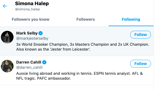 Simona Halep i-a dat unfollow lui Mark Selby pe Twitter, iar gestul româncei este unul total neașteptat. Mark era unul dintre cei doi oameni (celălalt fiind în continuare antrenorul Darren Cahill) pe care Simona îi urmărea pe Twitter, dar constănțeanca l-a înlocuit pe englez cu un personaj misterios, care nu are tangențe cu sportul.