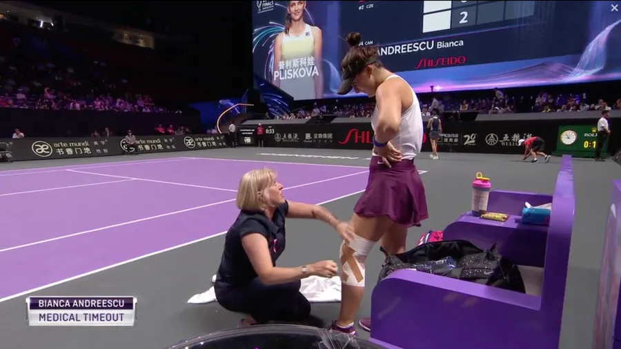♦ Pauză medicală! Bianca acuză dureri la genunchiul stâng dupăce s-a întins către un serviciu în exterior al Pliskovei și șchioapătă evident. Se îndreaptă spre banca ei și așteaptă fizioterapeuta. Bianca primește îngrijiri medicale. Partida este întreruptă în game-ul trei, în care Pliskova servește, la 30-15. Andreescu are 2-0 la game-uri.