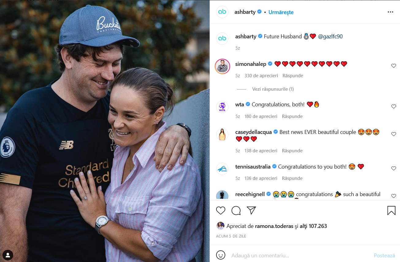 Barty a anunțat că se mărită cu Gary Kissick, bărbatul cu care se iubește de mai bine de cinci ani: „Viitorul soț!” a scris „Ash” pe Instagram, postând o fotografie în care se vede inelul de logodnă. Halep a reacționat la postarea australiencei, trimițându-i acesteia mai multe inimioare pe Instagram.