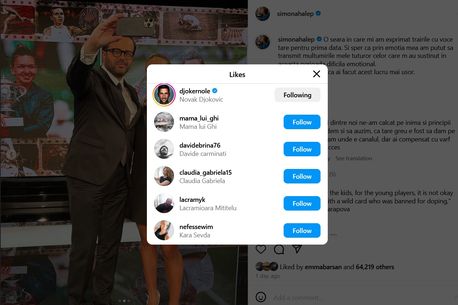 Noak Djokovic a făcut un gest care i-a uimit pe mulți, cel mai bun tenismen din lume reacționând la fotografiile în care Simona Halep apare alături de jurnalistul Mihai Gâdea. „Nole” i-a dat like Simonei, asta după ce românca a dezvăluit că sârbul i-a trimis mesaje atât înainte, cât și după verdictul TAS. „O seară în care mi-am exprimat trăirile cu voce tare pentru prima dată. Și sper că prin emoția mea am putut să transmit mulțumirile mele tuturor celor care m-au susținut in această perioadă dificilă emoțional. Mulțumesc, Mihai, că ai făcut acest lucru mai ușor”, a scris Halep pe Instagram.