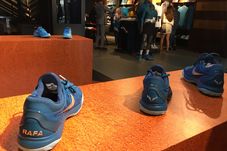 În stânga, două postere uriașe, cu Nadal și Șarapova, îți îndreaptă privirea către alte ecrane pe care sunt proiectate imaginile campaniei. Pantofii sport ai ibericului, cu inscripția Rafa și logo-ul aidoma unor cornițe de taur, pe albastrul marin, intens, ales pentru ediția 2018 a French Open-ului, sunt frumos așezați. De partea cealaltă a culoarului creat, stă modelul de pantof purtat și de Simona Halep, cu negrul care creează contrast cu nuanța selectată de americani pentru această ediție a Grand Slam-ului parizian. Șarapova a evoluat cu un model similar, dar ușor diferit.