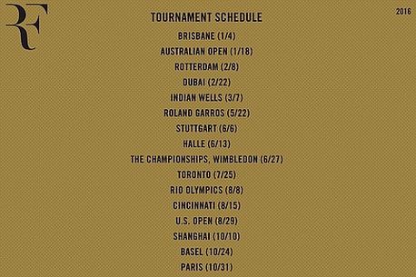 Roger Federer a publicat pe site-ul său oficial o schiță a programului său pentru 2016, iar distribuția turneelor produce rumoare: deși practic elvețianul și-a propus să joace doar cu două turnee mai puțin decât în 2015, (cu mențiunea că în lista tuturor jucătorilor de tenis din top se adaugă Jocurile Olimpice de la Rio). Sezonul roșu de zgură a fost măcelărit de campionul din 2009 de la French Open.