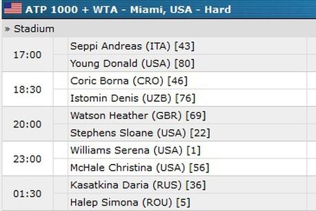 Înaintea partidei dintre Simona și rusoaica aflată pe 36 WTA mai sunt programate alte patru jocuri, primul începând de la ora 17:00. Înaintea Simonei Halep va păși pe arena din Miami marea rivală Serena WIlliams (SUA, 1 WTA), sportivă care se va duela cu Cristina McHale (SUA, 56 WTA) pentru un loc în turul trei.