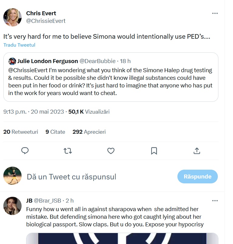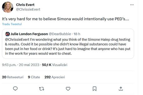„Sunt curioasă ce spui despre testul și rezultatele Simonei Halep! Crezi că e posibil să nu fi știut că cineva i-a pus substanțe interzise în mâncare sau băutură? E greu să ne imaginăm că cineva care a muncit enorm atâția ani ar vrea să trișeze”, a întrebat-o pe Chris Evert o urmăritoare, iar fosta mare tenismenă a oferit un răspuns care alimentează teoria conspirației: „Îmi e foarte greu să cred că Simona ar lua intenționat substanțe interzise!”.