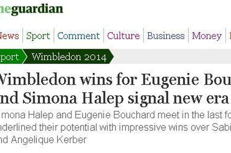 „Noua eră din tenis este tot mai aproape cu duelul din semifinale dintre canadianca Eugenie Bouchard și românca Simona Halep, două dintre cele mai promițătoare jucătoare, care au avut un salt rapid în ierarhia mondială”, a susținut cotidianul britanic. Atât Simona, cât și Eugenie fac parte din nou generație, prima având 22 de ani, în timp ce nord-americanca abia a trecut de 20 de ani. Halep a ajuns într-un an de zile numărul 3 mondial, plecând de undeva din zona locului 55, în timp ce Bouchard s-a calificat în semifinalele ultimelor trei turnee de Grand Slam, din șase participări posibile. „Ambele fac parte dintr-un grup de jucătoare care pot domina tenisul mondial în viitor. Cu surorile Williams aflate în declin și cu Maria Șarapova întrebându-ne ce ar fi fost dacă, probabil că viitorul este deja aici, la Wimbledon”, a mai punctat jurnalistul Hugh Muir de la The Guardian.