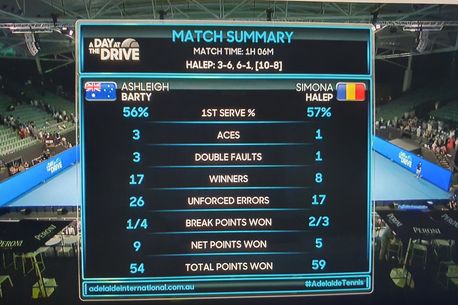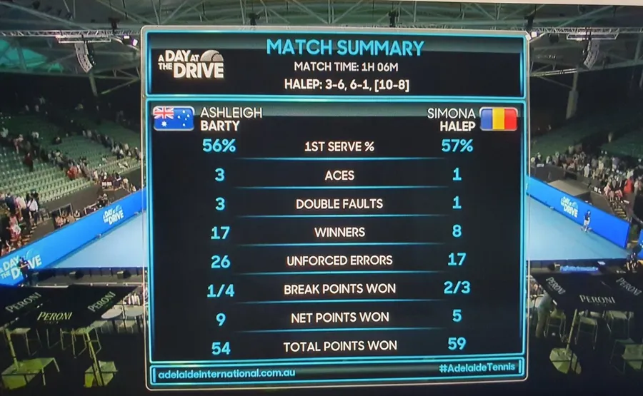 Românca a servit mai bine decât Barty, având un procentaj de 57% pe primul serviciu, față de 56 de procente înregistrate de australiancă! Deși Ashleigh a servit trei ași, aceștia au fost anulați de trei duble greșeli comise. De partea cealaltă, statistica arată că Simona a reușit un as și a făcut o dublă greșeală.