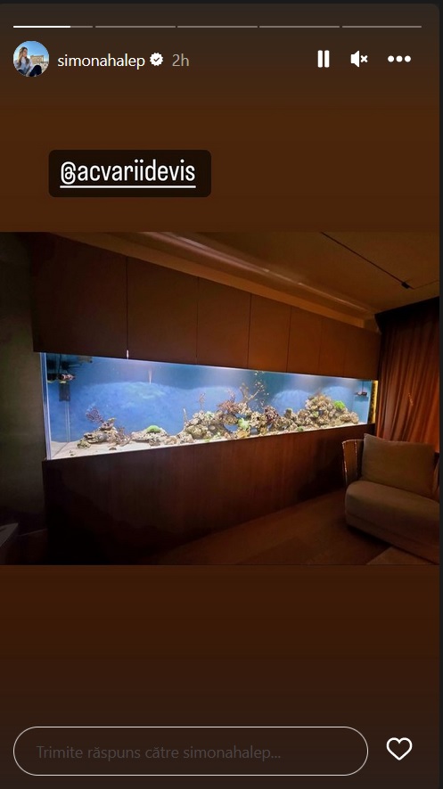 Halep a postat imaginea pe Instastory, menționând și firma de la care a achiziționat acvariul. Pe site-ul acesteia aflăm că „un acvariu în casa sau biroul dumneavoastră are diferite beneficii: nivel scăzut de stres, scăderea tensiunii și al ritmului cardiac, concentrare și creativitate îmbunătățite și multe alte avantaje pe care vă lăsăm să le descoperiți”.