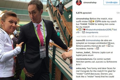 În paralel cu jobul de antrenor, Darren face și treaba de jurnalist la Wimbledon, așa că prima zi a turneului londonez a fost extrem de solicitantă pentru tehnician. Cahill a fost chemat de postul cu care are contract, ESPN, să comenteze meciurile care au precedat întâlnirea Halep – Schmiedlova. Șefii de la ESPN au fost însă înțelegători cu australianul și l-au lăsat pe acesta să-și reia atribuțiile de antrenor la timp, așa că Simona a răsuflat ușurată.