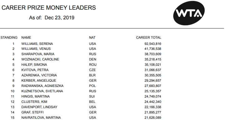În ceea ce privește sumele câștigate în întreaga carieră din tenis, topul este condus de Serena Williams. 92.543.816 dolari a câștigat până acum jucătoarea care se poate mândri cu 72 de titluri WTA. Venus Williams ocupă locul secund în acest top, dar nu a reușit să ajungă nici măcar la jumătatea sumelor câștigate de sora sa. Ultima poziție a podiumului este ocupată de rusoaica Maria Sharapova.