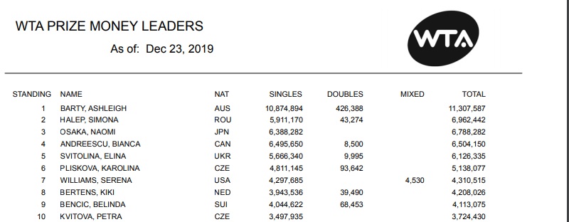 Pe primul loc în topul banilor din 2019 se află liderul clasamentului WTA. Premiile câștigate pe terenul de tenis au adus în conturile lui Ashleigh Barty 11.307.587 de dolari. Ultima poziție a podiumului a fost ocupată de japoneza Naomi Osaka, iar pe locul 4 se află Bianca Andreescu, jucătoarea canadiancă ai cărei părinți sunt născuți în România.