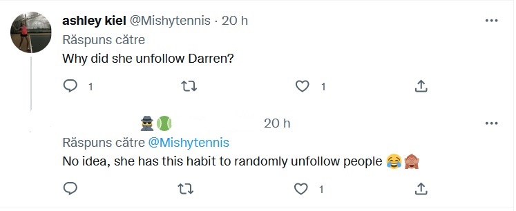 Fanii Simonei Halep nu au înțeles nici ei gestul jucătoarei de tenis: „De ce i-a dat unfollow lui Darren?”, a întrebat un utilizator de Twitter din SUA, iar o fană română a replicat „Nu am nicio idee! Ea are obiceiul de a le da unfollow oamenilor!”.