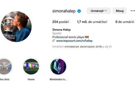 În acest moment, Simona Halep nu mai urmărește pe nimeni pe Instagram, deși contul ei are 1,7 milioane de urmăritori. În urmă cu câteva luni, românca l-a șters și pe antrenorul Patrick Mouratoglou din listă. Totodată, Halep și-a pus la profil o poză cu trofeul de la Roland Garros 2018, unde a triumfat cu ajutorul australianului Darren Cahill.