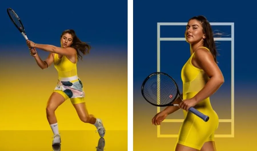 Simona Halep și Bianca Andreescu vor purta un echipament mulat constituit dintr-o singură piesă vestimentară, de culoare galbenă, la care este atașată o fustă cu diverse blocuri de culori.