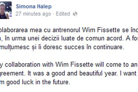 Simona a anunțat despărțirea, previzibilă de altfel, prin intermediul contului său oficial de Facebook. „Mulțumesc și mult succes pe viitor” i-a urat Halep fostului său antrenor. În doar 20 de minute, mesajul constănțencei, care a atins de curând un milion de fani pe rețelele de socializare, a strâns 1.300 de aprecieri. „Rezultatele de anul viitor vor vorbi despre această decizie”, „Dacă ai renunțat la Wim Fissette trebuie să îți iei un antrenor și mai bun” – sunt câteva dintre răspunsurile fanilor, care o încurajează pe „Halepeno”, chiar dacă părerile sunt împărțite între „este o greșeală”, „păcat, cred că te-a dus un nivel mai sus. Dar cred că vei găsi pe cineva și mai bun. Succes!” și o aprobare extremă – „prima veste bună! Cea mai bună alegere! Baftă!„.