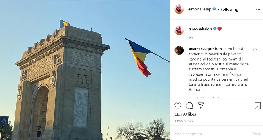 Halep a urcat pe Instagram o fotografie cu tricolorul arborat pe Arcul de Triumf, iar alături a postat o inimioară! Monumentul care comemorează victoria României în Primul Război Mondial nu a mai fost la fel de vizitat precum în anii precedenţi din cauza pandemiei.