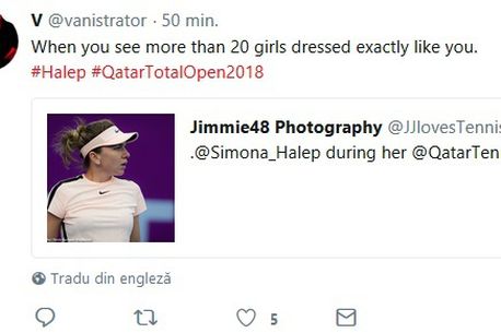 Un fan al letonei Jelena Ostapenko „a înțepat-o” pe Simona Halep după meciul cu Ekaterina Makarova. Acesta a postat o fotografie în care Simona pare supărată, interpretând într-un mod răutăcios imaginea: „Atunci când vezi peste 20 de fete îmbrăcate exact la fel ca tine…”. Este totuși posibil ca Simona să primească un echipament personalizat în viitor, mai ales că are șanse reale să revină pe locul 1 WTA.