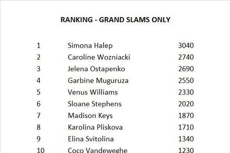 Dincolo de avantajul pe care îl are în clasamentul oficial WTA (440 puncte față de Wozniacki și peste 1.790 puncte față de toate celelalte urmăritoare), Simona Halep are cele mai multe puncte strânse în ultimele patru turnee de Mare Șlem (300 puncte în fața lui Wozniacki) și cele mai multe puncte adunate în turneele Premier Mandatory și Premier 5 (1.231 puncte în plus față de Garbine Muguruza) – potrivit unui avid furnizor de statistici despre tenis, din Berlin.