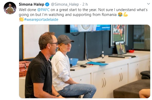 „Felicitări, Port Adelaide, pentru startul excelent de sezon. Nu sunt sigură că înțeleg ce se petrece pe teren, dar mă uit și vă încurajez din România”, a scris Halep pe Twitter.