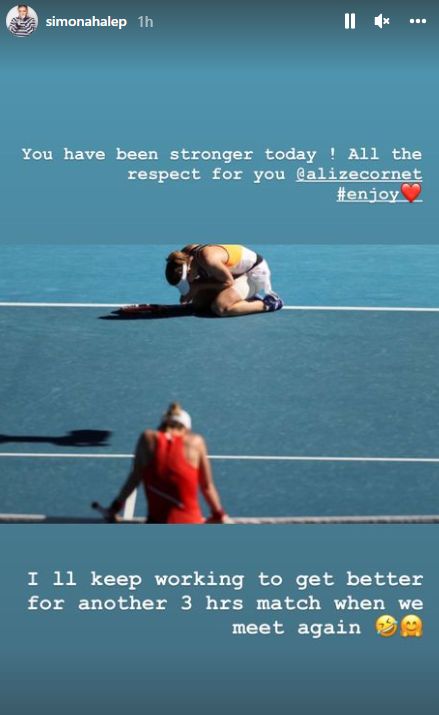 „Ai fost mai puternică astăzi! Tot respectul pentru tine, Alize Cornet! Bucură-te de victorie! Mă voi antrena în continuare ca să fiu pregătită pentru un nou meci de trei ore, când ne vom întâlni din nou”, a scris Simona Halep, pe Instagram.