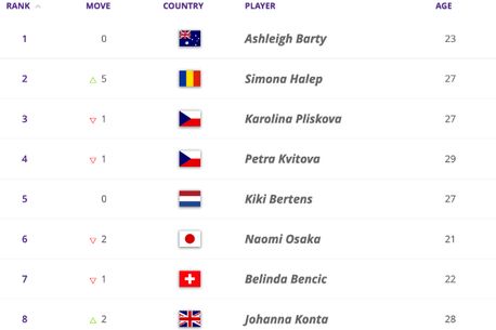 Locul 4 în cursa pentru Turneul Campioanelor la finalul lunii martie, Bianca Andreescu, reprezentanta de origine română a Canadei, a coborât pe locul 13 în Race, după ce a ratat, practic, sezoanele de zgură și de iarbă, având un singur meci disputat după turneul de la Miami, din martie (prim tur la Roland Garros, urmat de abandon înaintea turului doi).