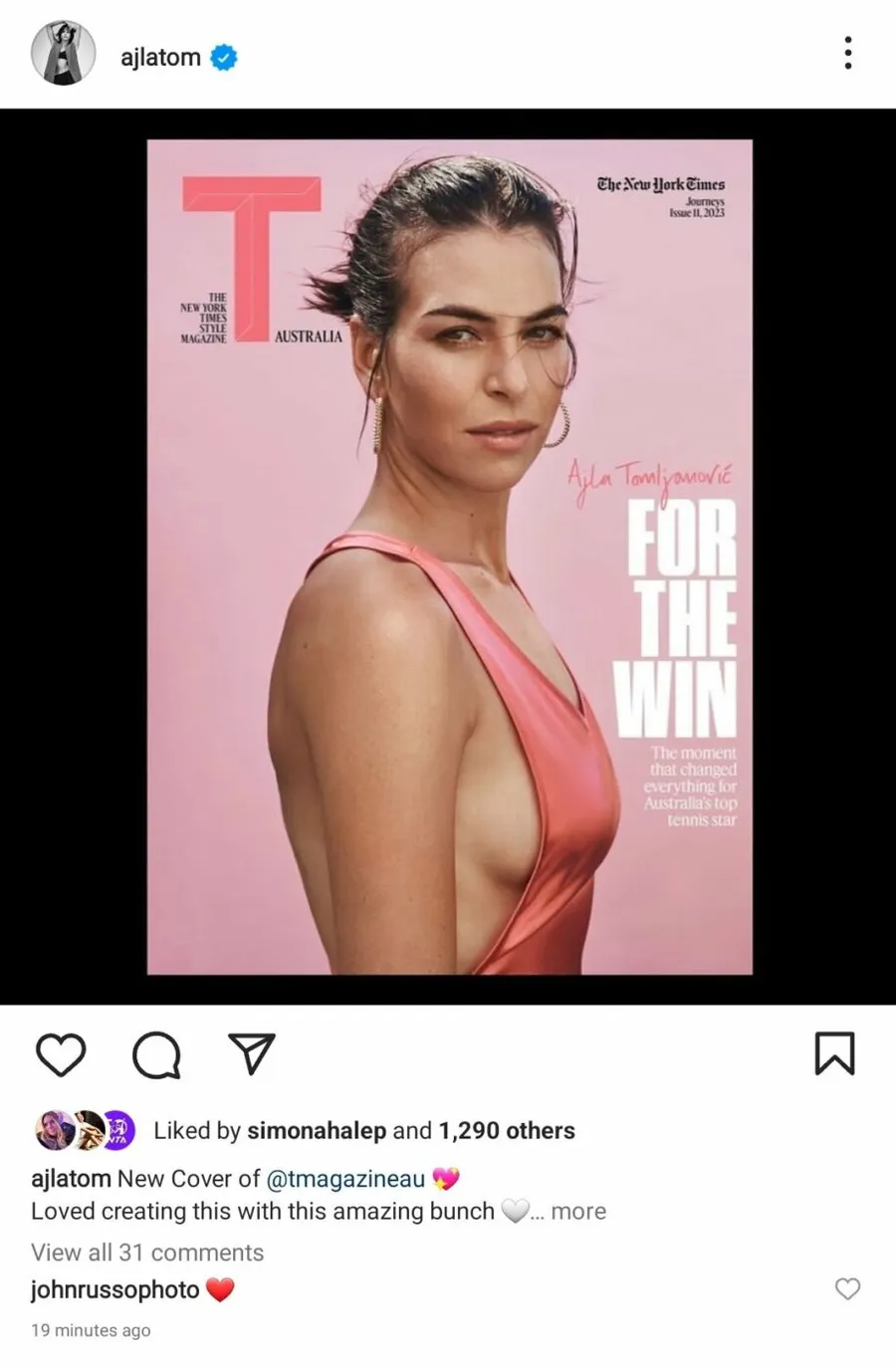 Ajla Tomljanovic, sportivă pe care Simona Halep a învins-o de cinci ori în tot atâtea partide, a postat pe Instagram imaginile senzuale cu ea, apărute în revista „The New York Times Style Magazine”. Halep a admirat fotografiile cu Tomljanovic și i-a dat like australiencei.