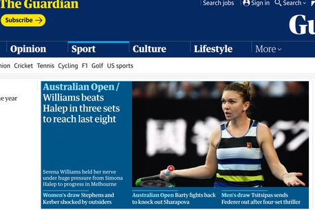 Și britanicii de la The Guardian au reflectat victoria și au elogiat-o pe jucătoarea în vârstă de 37 de ani. Jurnaliștii de la publicația citată au realizat un liveblog consistent în care au pus accentul pe viteza serviciului liderului mondial, dar și pe forța mentală a Simonei, constănțeanca revenindu-și în stil de mare campioană după ce a cedat manșa inaugurală, 1-6.