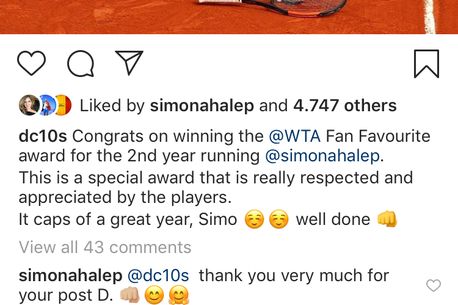Halep a răspuns după aproximativ o oră: „Îți mulțumesc mult de tot pentru postare, D.