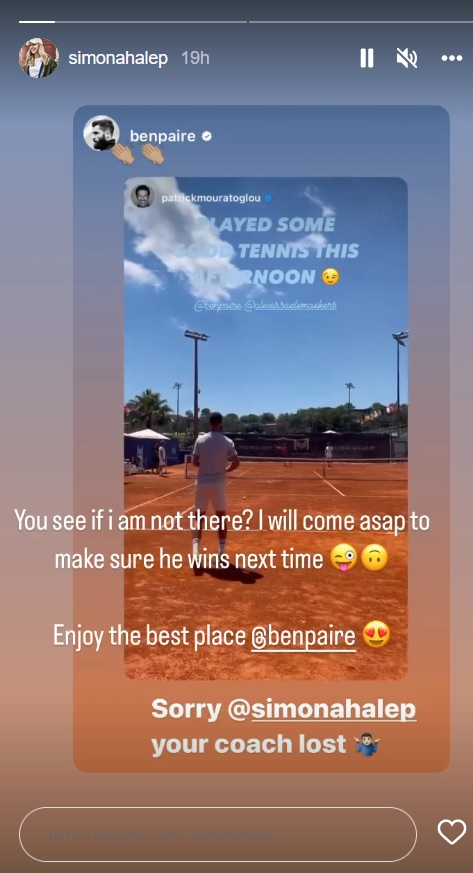 Benoit i-a adresat un mesaj Simonei după ce l-a învins pe antrenorul româncei, Patrick Mouratoglou, la un antrenament care a avut loc la academia din Nisa a tehnicianului francez.
