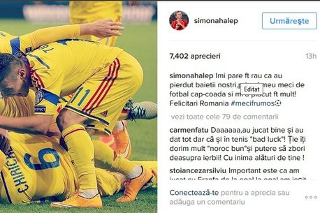 Simona și-a exprimat tristețea pricinuită de rezultatul final, dar și admirația pentru atitudinea tricolorilor. După primul meci de fotbal pe care l-a vizionat de la început și până la sfârșit, Halep a postat pe Instagram: „Îmi pare foarte rău că au pierdut băieții noștri. A fost primul meu meci de fotbal cap-coadă și mi-a plăcut foarte mult. Felicitări, România! #meci frumos”.