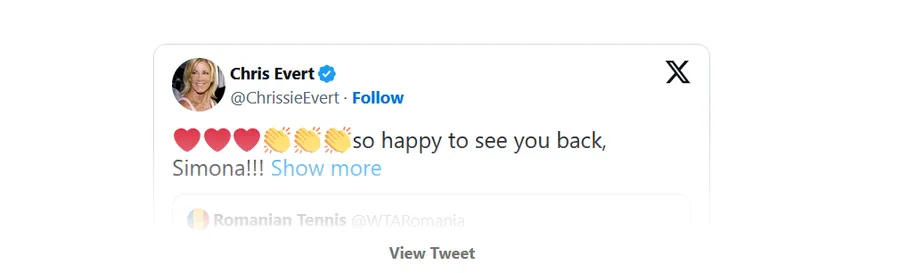 Postarea a fost primită cu mare entuziasm de către legendara Chris Evert, care și-a împărtășit imediat bucuria: „Atât de fericită să te revăd, Simona!!!!”. Mesajul a fost însoțit de mai multe emoji-uri în formă de inimă, semn că legătura între cele două este una cu adevărat specială.