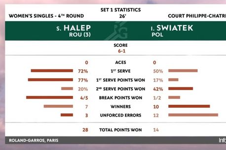 Este o execuție în direct pentru Swiatek, dar și o lecție. Cel mai bun raliu al polonezei apare după cinci game-uri și un punct. Simona aleargă, însă devine vulnerabilă pe rever. Returul fostei câștigătoare a probei de dublu de la Paris se dezmorțește. Vine o rază laser în lung de linie – dintr-acelea văzute de Annabel Croft. Vine și break-ul, însă Simona are imediat minge pentru a câștiga setul. Swiatek nu citește intențiile deținătoarei trofeului. Când o face – la prima minge de set a româncei, are capacitatea de a trimite decisiv (a trimis diagonală curată, plată și alertă). Procentul de reușită este încă scăzut, iar două erori consecutive îi aduc game-ul în cont Simonei, după 26 de minute.
