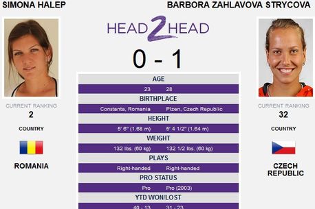 Simona și Barbora s-au mai întâlnit o singură dată în carieră, însă cu mult timp în urmă. Reprezentanta Cehiei i-a lăsat doar cinci game-uri româncei în calificările de la Paris 2010, câștigând partida cu 6-1, 6-4. A doua jucătoare a lumii trebuie să-și trateze adversara cu atenție și prin prisma faptului că Zahlavova a făcut sfert de finală la Wimbledon 2014. Acolo a pierdut în fața compatrioatei Petra Kvitova (3 WTA), cea care a devenit apoi campioană pe iarba londoneză.