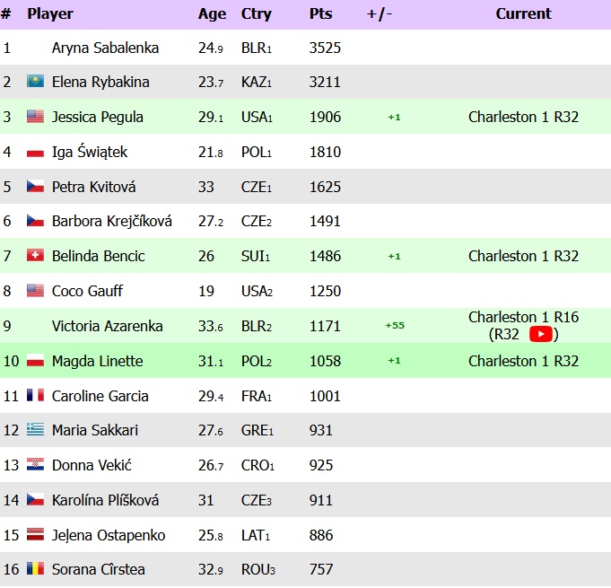 Celelalte sportive aflate pe locuri calificabile sunt: 1. Aryna Sabalenka (Belarus, 3.525 puncte); 2. Elena Rybakina (Kazahstan, 3.211 puncte); 3. Jessica Pegula (SUA, 1.906 puncte); 4. Iga Swiatek (Polonia, 1.810 puncte); 5. Petra Kvitova (Cehia, 1.625 puncte); 6. Barbora Krejcikova (Cehia, 1.491 puncte) și 7. Belinda Bencic (Elveția, 1.486 puncte).