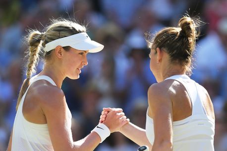 Foto: Eugenie Bouchard, liderul rezultatelor din turneele de Grand Slam, dă mâna cu Simona Halep după semifinala de la Wimbledon, câștigată cu 7-6, 6-2 de canadicancă.
