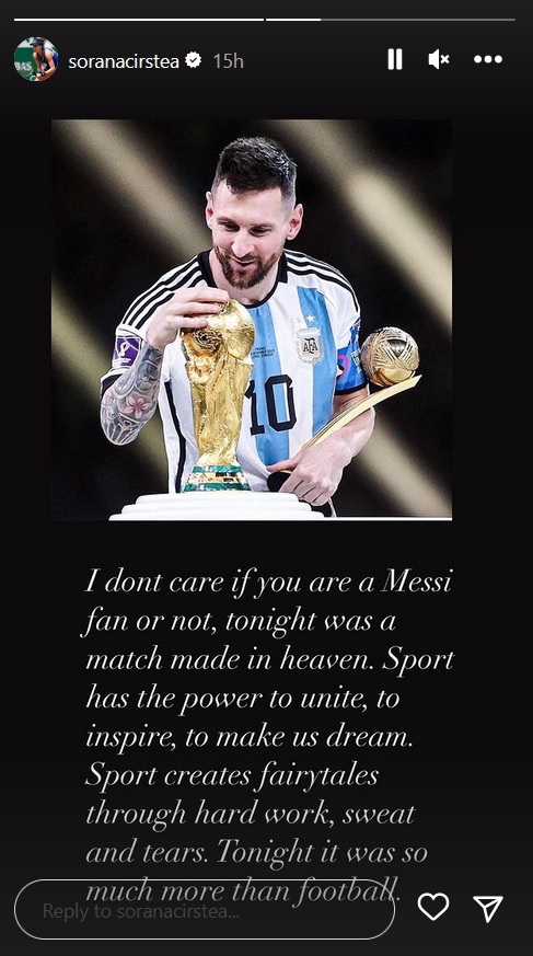 Sorana Cîrstea a fost fascinată de finala Campionatului Mondial de fotbal: „Nu îmi pasă dacă ești fan Leo Messi sau nu, în seara asta a fost un meci desprins din Rai! Sportul are puterea de a uni, de a inspira, de a ne face să visăm. Sportul generează povești croite prin muncă, sudoare și lacrimi. În seara asta a fost mai mult decât fotbal”, a fost mesajul postat de Sorana Cîrstea, alături de o poză cu Leo Messi și trofeul Cupei Mondiale.