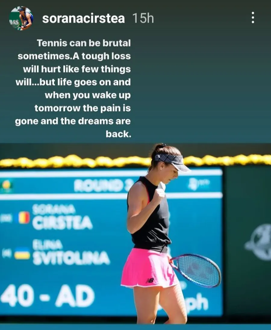 Totodată, „Sori” a fost afectată de înfrângerea cu Svitolina, dar și-a alungat repede supărarea: „Tenisul poate fi brutal uneori! O asemenea înfrângere doare mai tare decât multe alte lucruri. Dar viața merge înainte și atunci când te trezești a doua zi durerea pleacă, iar visele se întorc”, a mai scris Cîrstea pe pagina ei de Instagram.