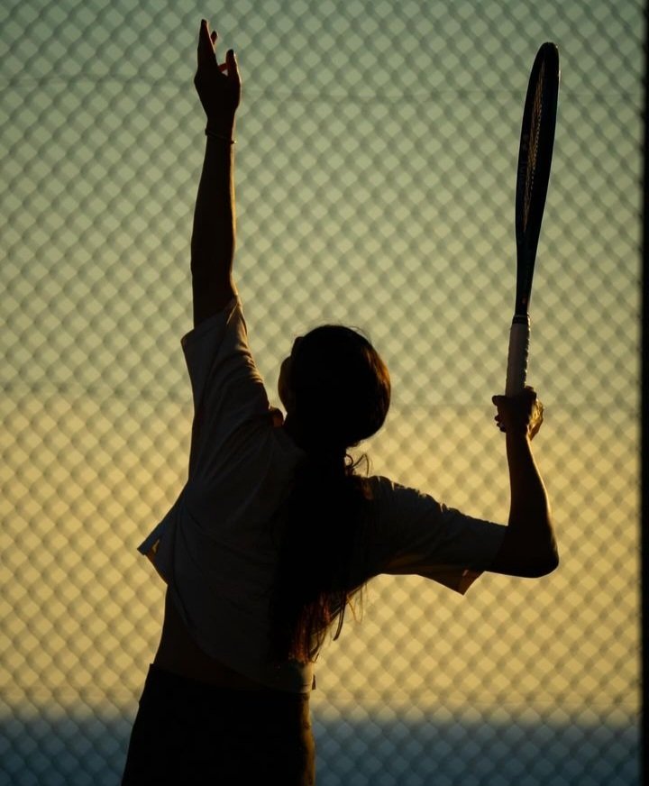În a doua fotografie postată pe Instagram, jucătoarea antrenată de suedezul Thomas Johansson lansează mingea la serviciu, lăsându-și abdomenul la vedere.