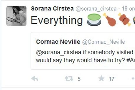 Sorana Cîrstea (25 de ani) și-a rupt joi degetul mare al piciorului stâng, iar jucătoarea de tenis încearcă să depășească nefericitul eveniment. Accidentarea o ține în casă pe Sorana, care consideră că trebuie să scape de plictiseală intrând în contact cu fanii. Tenismena clasată acum pe locul 244 WTA a inițiat o sesiune de întrebări și răspunsuri pe Twitter, iar curiozitățile fanilor au fost numeroase. Aceștia au aflat detalii picante despre pasiunile și activitățile favoritei lor:
