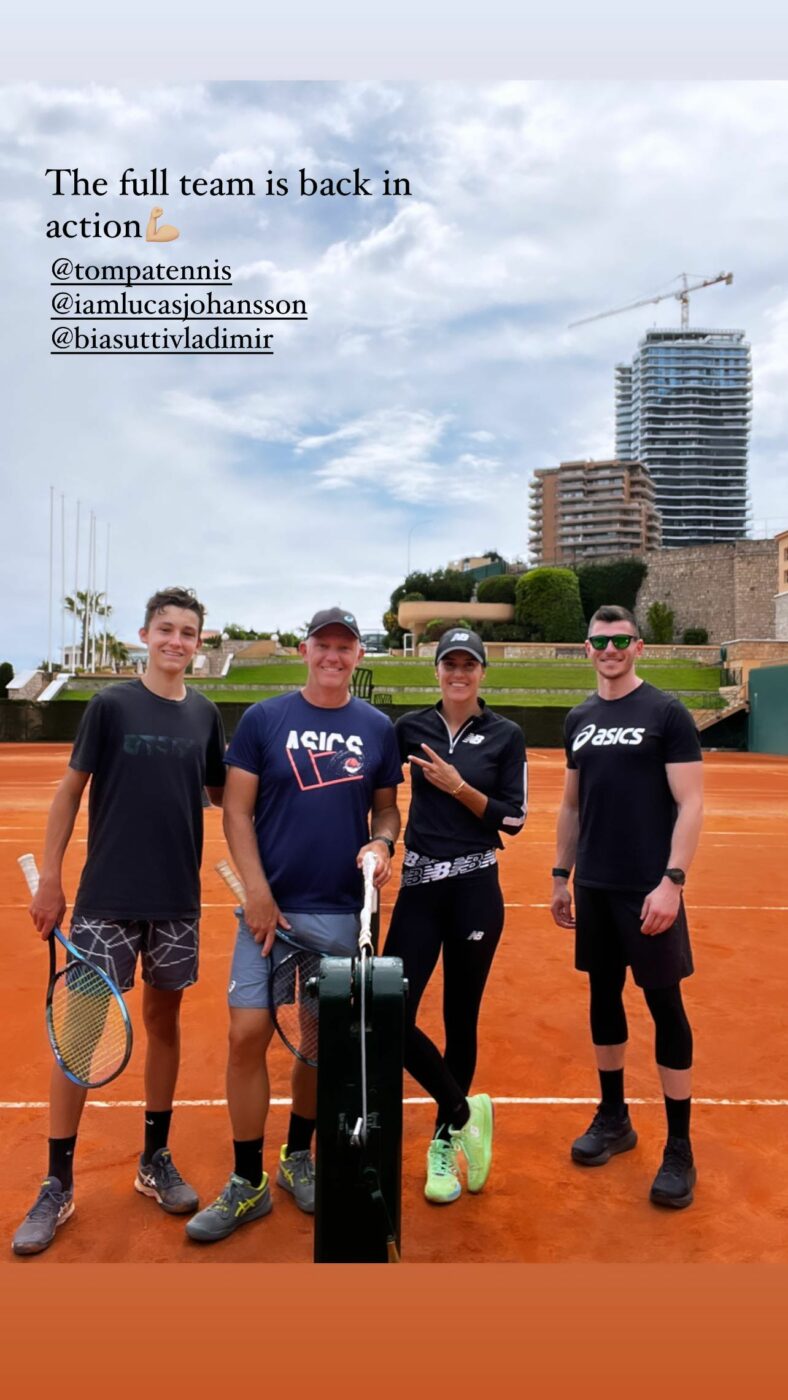 „Echipa completă este din nou în acțiune!”, a anunțat Sorana Cîrstea, joi, în descrierea fotografiei cu Thomas Johansson, Vladimir Biasutti și Lucas Johansson, realizată pe terenul de zgură de la Monte Carlo.